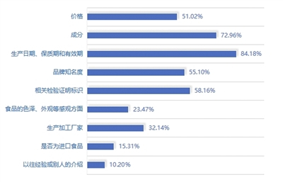 生产日期等信息是消费者选购食品的重要指标,调查发现,超八成的消费者表示选购食品时会查看生产日期、保质期和有效期。超七成的消费者表示选购食品时会查看成分表,消费者对食品添加剂的使用非常关注,不希望食品中添加不必要的成分。超五成的消费者选购食品时会查看相关检验证明标识、品牌知名度及产品价格,如果发现标签上有虚假宣传或者信息不全等情况,他们会放弃购买该商品。