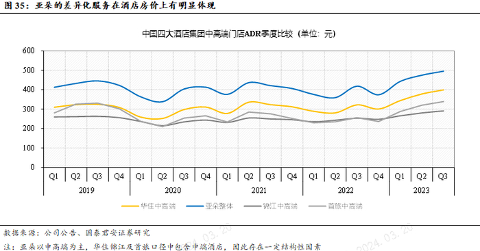 服务比商品依靠情绪价值提升体验的空间更大,效率型服务业情绪价值能够带来溢价。效率型服务业本质上是时间价值的交换,服务相对同质化,安全性、性价比、便捷度是核心能力。但服务业区别于商品的特征在于体验缺乏标准化的评价体系和指标,因此有较多通过情绪价值来提供差异化体验的空间。以亚朵酒店为例,酒店在以效率和成本为导向的有限服务型酒店中,通过将体验的标准化(强调结果而非服务过程),提供“可感知的差异化”的入住体验。这种差异化的服务也支撑了亚朵作为行业后来者,成功占据中高端酒店细分品类的消费者心智,并以相对较低的装修成本,实现了ADR相比同行业的溢价。