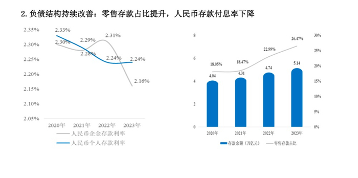 同时,零售存款占比持续提升,由2020年的18.05%提升至2023年的26.47%。