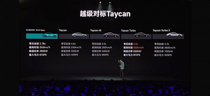 在整个小米汽车SU7的研发过程中,小米毫不避讳地表示,就是在对标保时捷Taycan。在发布会上,雷军再次提到,小米SU7是目前50万以内速度最快的量产车,媲美百万豪车,最高车速达到265km/h。“设计这款产品的时候是直接对标保时捷来做的,所以我们在每一个性能表现上都跟保时捷Taycan去死磕。