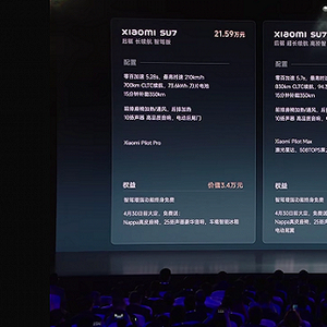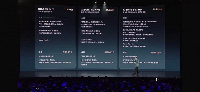 小米董事长雷军在会上公布了小米汽车SU7的最终定价:标准版 21.59万元,PRO版本24.59万元,“性能猛兽”Max版29.99万元,带有特殊标识和雷军签名纪念品的创始版,限量5000台,价格与标准版和Max版靠齐。在公布价格同时,雷军频繁提到一句话“冰箱、豪华音箱、真皮座椅、小米智驾PRO免费送。”