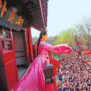 游客在开封清明上河园景区观看抛绣球招女婿民俗表演。记者 聂冬晗 摄