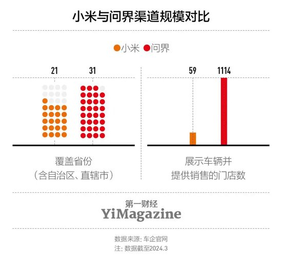 除了产品和价格之外,小米手中的牌还有它的品牌和渠道。和另一家从手机市场杀入汽车领域的巨头华为一样,小米在全国拥有上万的零售门店和过亿的终端用户,理论上它能以极快的速度让自己的渠道规模达到一个耕耘多年的传统汽车品牌。但小米并没有广泛地大面积铺设门店,目前仅在全国开了59家门店,单算门店数量还不及华为的零头。但考虑到华为和赛力斯合作问界之初在拓展渠道上走过一些弯路,比如存在华为渠道和赛力斯渠道互相抢客的问题,也存在华为渠道内部电子产品和汽车业务顾此失彼的问题,从2021年发布问界之后,华为花了近两年时间才逐步理顺渠道。小米这次选择小范围试水,很可能也是想降低渠道方面的风险。雷军在发布会上也明确表示,“模式跑通后”会加速扩展渠道。