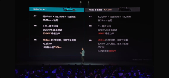 对于SU7来说,比亚迪和极氪的成绩可能是它的目标基准线,而Model 3是它想取代的对象。产品上看,相比于进入车型生命周期尾声的Model 3,SU7明面上优势明显。单电机版本的SU7低配版在续航、电机性能等方面的数据均优于 Model 3的单电机版本,而且SU7入门款比Model 3要便宜3万元。雷军直接在发布会上喊出“买Model 3的朋友为什么不买SU7,我想不通”。