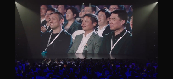 “蔚小理”品牌负责人李斌(左)、何小鹏(中)、李想(右)参与昨天的su7发布会。