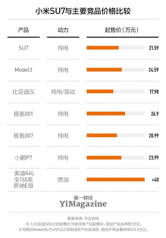 自从2020年Model 3国产以来,所有本土纯电轿车的目标都是挑战特斯拉,2024年上市的SU7可能是第一个真正有机会挑战它的产品,而21.59万元的起售价是实现这一点的基础。在特斯拉强大的保有量基础和品牌能量面前,一款新的纯电轿车提供足够好的综合体验和配置优势还不够,必须同时在价格上有足够优势,才有可能扭转消费者的心智。