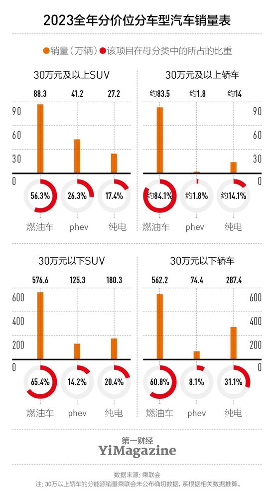 在两个多月前的发布会上,雷军已经完整介绍SU7的车型定位和技术配置,唯一的悬念就是价格。而能把价格打到多低,对小米汽车来说也的确是事关生存的问题。在“纯电”和“轿车”这两个先决条件下,价格决定了SU7的销量空间。因为相比于混合动力,纯电现阶段会天然排除掉一部分潜在受众,而轿车、尤其是轿跑车,与SUV之间也存在一定的决策壁垒。30万元是一道坎,根据乘联会的数据,在30万元以上轿车市场中,纯电产品的占比只有大约14%,这个比例不足30万元轿车市场的一半。换句话说,这个细分市场目前仍属于传统的高端燃油车,纯电车型尚未渗透进来,曾经瞄准这个市场的极氪001、蔚来ET5目前都已经把起售价调到30万元以下。大家都意识到如果想要提高销量,必须把价格降下来。