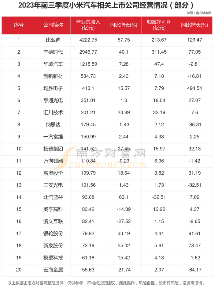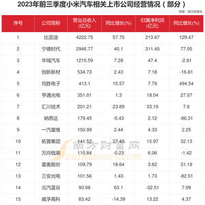 当前,A股共有78家小米汽车相关上市公司,2023年前三季度营业收入合计12185.91亿元,归母净利润共708.01亿元。其中,3家上市公司营业收入超千亿,13家上市公司营业收入超100亿,53家上市公司营业收入超十亿。