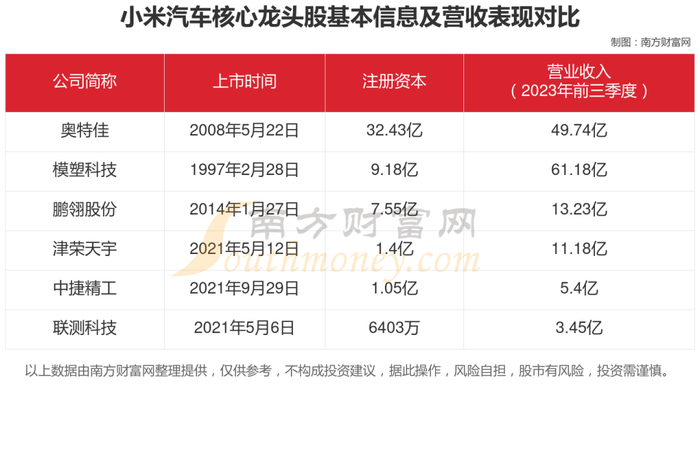 小米汽车核心龙头股中,奥特佳注册资本高达32.43亿,2023年前三季度公司营业收入49.74亿元;模塑科技注册资本9.18亿,2023年前三季度公司营业收入61.18亿元;鹏翎股份、津荣天宇、中捷精工、联测科技注册资本分别为7.55亿、1.4亿、1.05亿、6403万,2023年前三季度营业收入分别为13.23亿、11.18亿、5.4亿、3.45亿。