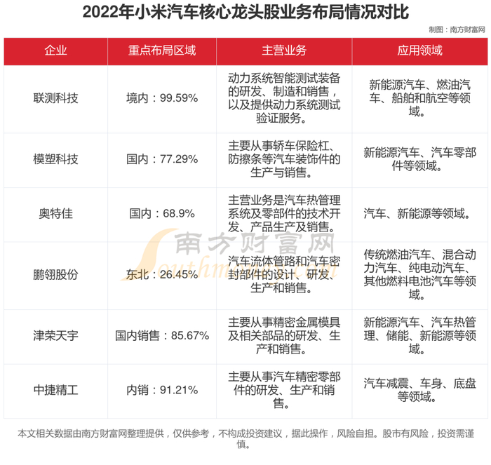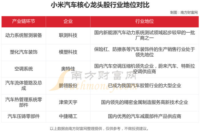 根据南方财富网趋势选股系统数据显示,小米汽车核心龙头股包括联测科技、模塑科技、奥特佳、鹏翎股份、津荣天宇、中捷精工。