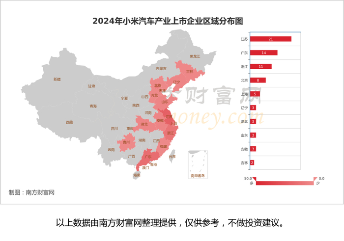 从上市公司地区的分布情况来看,A股78家小米汽车相关上市公司分布在江苏、广东、浙江、北京、上海等省市,总体来看主要集中于华东区域。