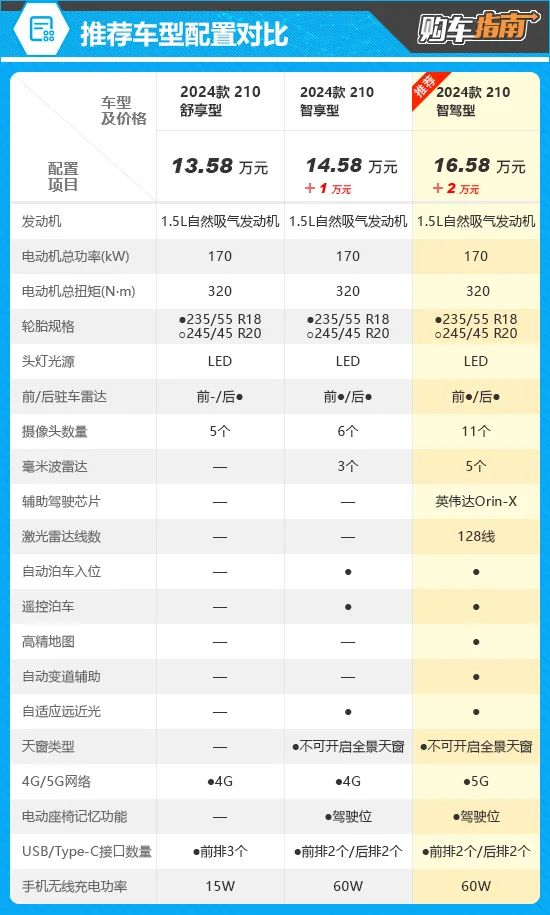 综合配置及价格来看,向您推荐指导价为16.58万元的210智驾版。其相比中档配置的车型贵出20,000元,但是搭载了辅助雷达芯片和128线程激光雷达等智驾硬件,可以给消费者呈现更方便快捷的辅助驾驶体验。另外,价值10000元全套套装,编辑建议有必要选装,在外观、内饰上都有不错的视觉效果和舒适感受,更符合“年轻人更理想的家”的定位。