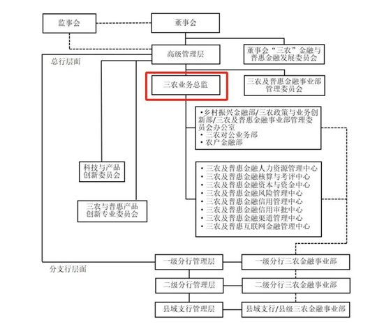 在三农金融事业部管理架构内,三农业务总监分管农行总行的3个一级部门(乡村振兴金融部、三农对公业务部、农户金融部)、8个普惠金融相关的中后台管理中心、以及多级分支行的三农金融事业部。