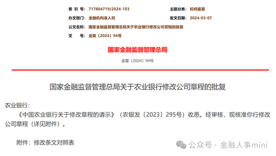 3月18日,国家金融监管总局官网公告,经审核,于3月7日核准农行修改公司章程。