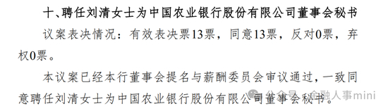 3月28日,农行董事会决议公告,聘任刘清女士为本行董事会秘书及公司秘书,聘任伍秀薇女士为本行联席公司秘书。刘清的董事会秘书任职资格尚待金融监管总局核准,此前其职务是农行国际金融部总经理。