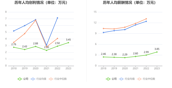 截至2023年末,公司员工总数为30828人,同比减少7.56%;人均创收16.36万元,人均创利3.45万元,人均薪酬3.85万元,较上年同期分别增长28.05%、17.99%、28.47%。