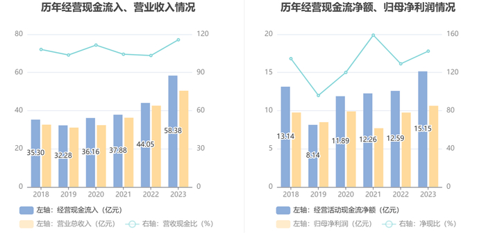 2023年,公司经营活动现金流净额为15.15亿元,同比增长20.27%;筹资活动现金流净额-7.80亿元,同比减少5847.94万元;投资活动现金流净额-14.22亿元,上年同期为8.34亿元。