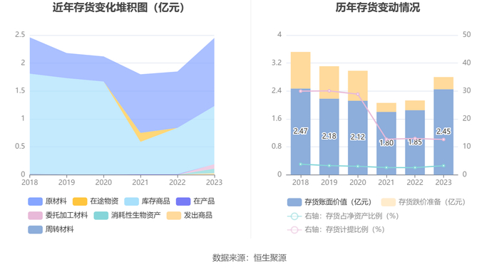 从存货变动来看,截至2023年年末,公司存货账面价值为2.45亿元,占净资产的3.26%,较上年末增加5991.49万元。其中,存货跌价准备为3545.66万元,计提比例为12.65%。
