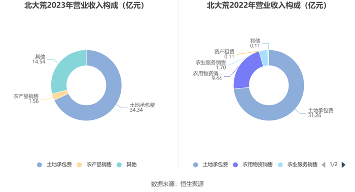 分产品来看,2023年公司主营业务中,土地承包费收入34.34亿元,同比增长9.86%,占营业收入的68.08%;农产品销售收入1.56亿元,同比增长6630.56%,占营业收入的3.09%。