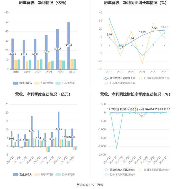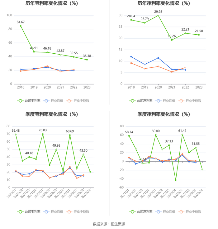 2023年,公司毛利率为35.38%,同比下降4.17个百分点;净利率为21.50%,较上年同期下降0.71个百分点。从单季度指标来看,2023年第四季度公司毛利率为20.75%,同比下降1.12个百分点,环比下降22.75个百分点;净利率为-18.63%,较上年同期上升23.84个百分点,较上一季度下降50.18个百分点。