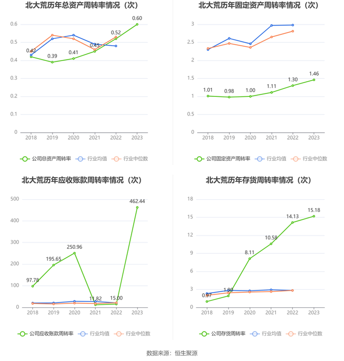 营运能力方面,2023年,公司公司总资产周转率为0.60次,上年同期为0.52次(2022年行业平均值为0.48次,公司位居同行业12/22);固定资产周转率为1.46次,上年同期为1.30次(2022年行业平均值为2.98次,公司位居同行业15/22);公司应收账款周转率、存货周转率分别为462.44次、15.18次。