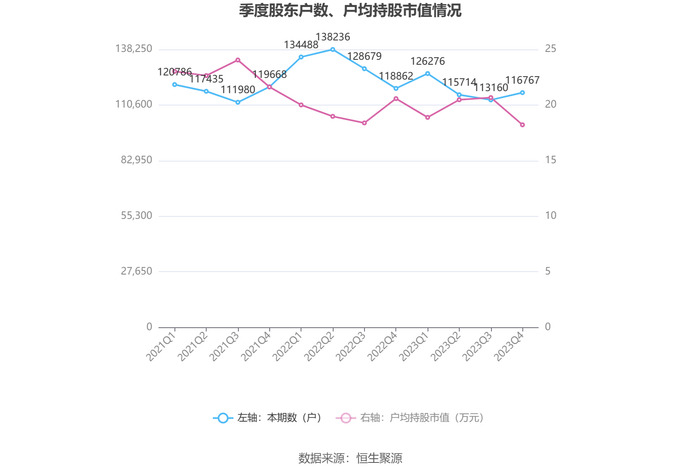 筹码集中度方面,截至2023年年末,公司股东总户数为11.68万户,较三季度末增长了3607户,增幅3.19%;户均持股市值由三季度末的20.67万元下降至18.22万元,降幅为11.85%。