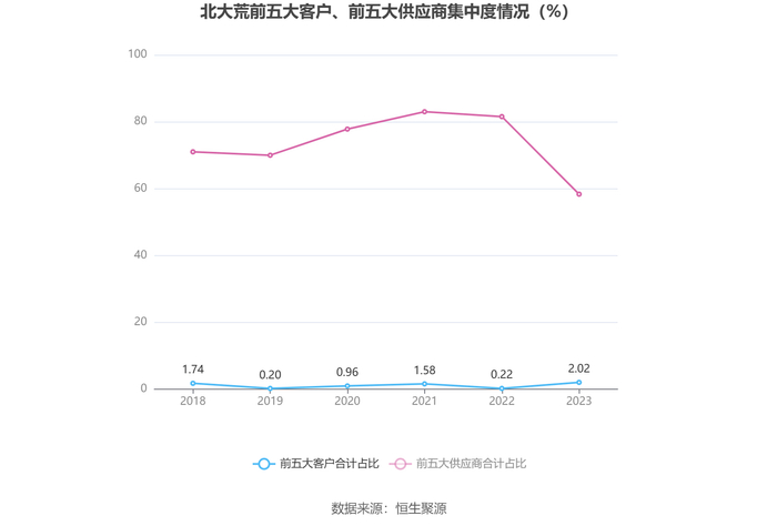 报告期内,公司前五大客户合计销售金额1.02亿元,占总销售金额比例为2.02%,公司前五名供应商合计采购金额13.46亿元,占年度采购总额比例为58.33%。