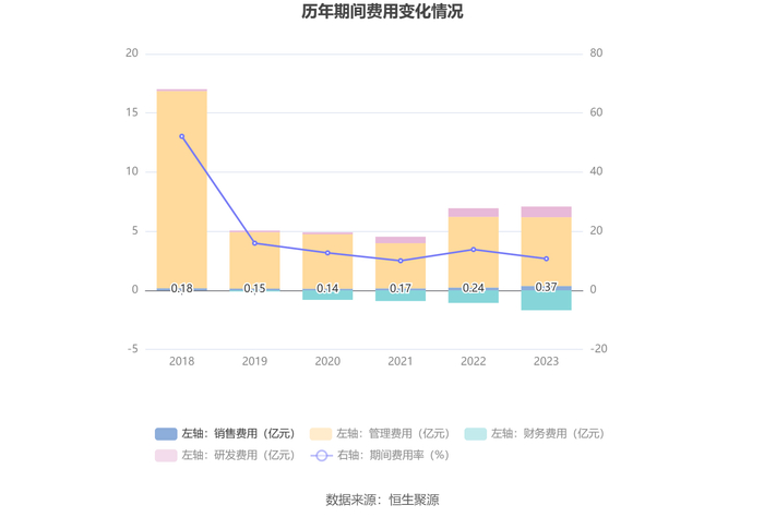 2023年,公司期间费用为5.41亿元,较上年同期减少4912.69万元;期间费用率为10.72%,较上年同期下降3.12个百分点。其中,销售费用同比增长53.37%,管理费用同比下降2.71%,研发费用同比增长22.88%,财务费用由去年同期的-1.06亿元变为-1.68亿元。