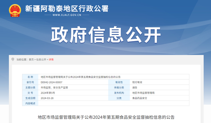 新疆阿勒泰地区市场监督管理局关于公布2024年第五期食品安全监督抽检信息的公告