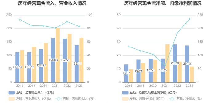 2023年,公司经营活动现金流净额为27.43亿元,同比下降2.73%;筹资活动现金流净额-19.19亿元,同比减少12.71亿元;投资活动现金流净额-11.62亿元,上年同期为-11.93亿元。