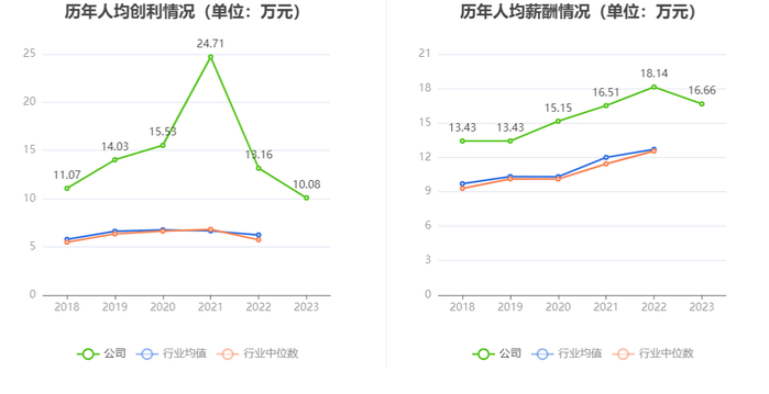 截至2023年末,公司员工总数为11551人,人均创收143.59万元,人均创利10.08万元,人均薪酬16.66万元,较上年同期分别下降7.28%、23.42%、8.15%。