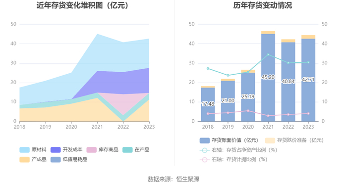 从存货变动来看,截至2023年年末,公司存货账面价值为42.71亿元,占净资产的30.54%,较上年末增加1.87亿元。其中,存货跌价准备为1.83亿元,计提比例为4.12%。