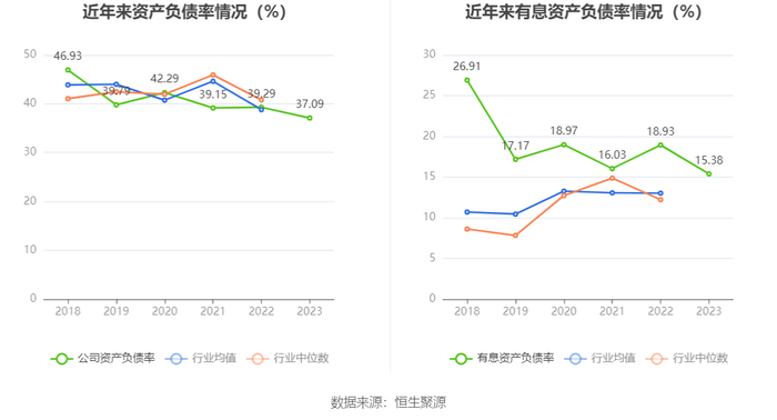 在偿债能力方面,公司2023年年末资产负债率为37.09%,相比上年末下降2.20个百分点;有息资产负债率为15.38%,相比上年末下降3.55个百分点。