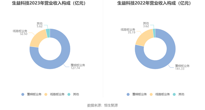 分产品来看,2023年公司主营业务中,覆铜板业务收入127.74亿元,占营业收入的77.02%;线路板业务收入32.50亿元,占营业收入的19.60%。