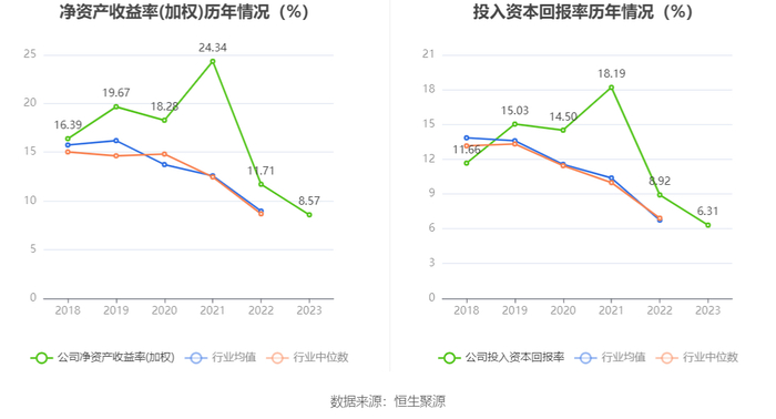 数据显示,2023年公司加权平均净资产收益率为8.57%,较上年同期下降3.14个百分点;公司2023年投入资本回报率为6.31%,较上年同期下降2.61个百分点。