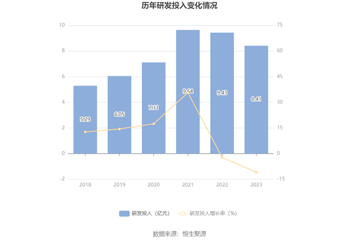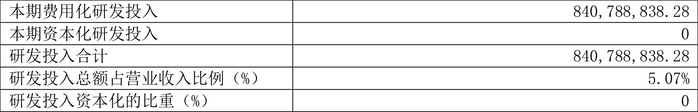 2023年全年,公司研发投入金额为8.41亿元,同比下降10.86%;研发投入占营业收入比例为5.07%,相比上年同期下降0.13个百分点。此外,公司全年研发投入资本化率为0。