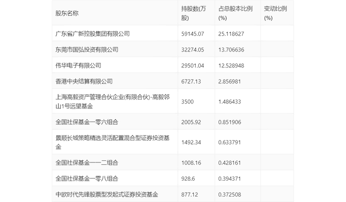 年报显示,2023年年末公司十大流通股东中,新进股东为景顺长城策略精选灵活配置混合型证券投资基金、中欧时代先锋股票型发起式证券投资基金,取代了三季度末的东莞市科创资本产业发展投资有限公司、国泰基金管理有限公司-社保基金1102组合。在具体持股比例上,广东省广新控股集团有限公司、东莞市国弘投资有限公司、上海高毅资产管理合伙企业(有限合伙)-高毅邻山1号远望基金持股有所上升,伟华电子有限公司、香港中央结算有限公司、全国社保基金一零六组合、全国社保基金一一二组合、全国社保基金一零八组合持股有所下降。