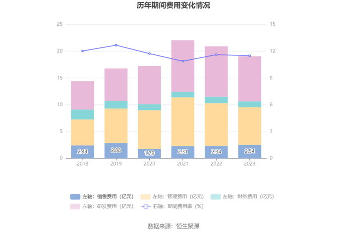 2023年,公司期间费用为19.08亿元,较上年同期减少1.85亿元;期间费用率为11.50%,较上年同期下降0.12个百分点。其中,销售费用同比增长8.74%,管理费用同比下降11.97%,研发费用同比下降10.86%,财务费用同比下降6.76%。