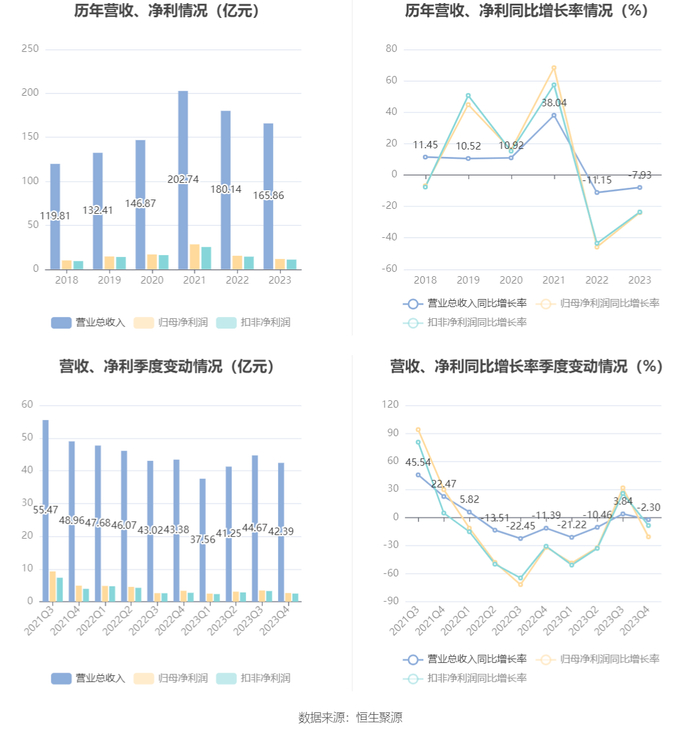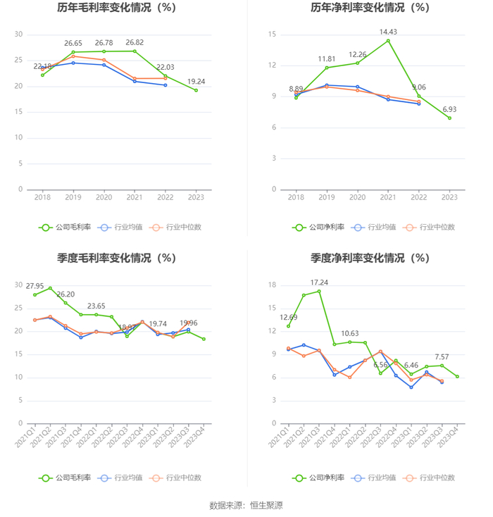 2023年,公司毛利率为19.24%,同比下降2.79个百分点;净利率为6.93%,较上年同期下降2.13个百分点。从单季度指标来看,2023年第四季度公司毛利率为18.38%,同比下降3.68个百分点,环比下降1.58个百分点;净利率为6.15%,较上年同期下降2.08个百分点,较上一季度下降1.42个百分点。