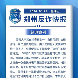 受害人李某在抖音看到一个自称可提供法律咨询、帮忙追债的视频,由于之前有人欠李某的钱一直不还,李某便添加了视频中“律师”的微信好友。“律师”询问欠款情况后称可以帮忙追回,但需要500元手续费,李某转账支付后,对方发来一张委托书表示已接受李某的委托,将持续跟进。两天后对方再次联系李某称准备起诉欠款人,需再支付一笔起诉费2500元,李某再次转账后对方称需等待15个工作日出结果。李某家人得知此事后意识到被骗,于是报警。