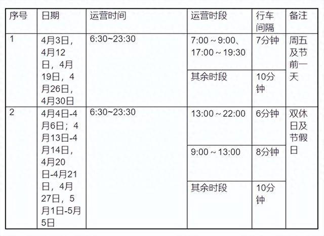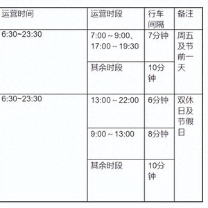 调整后的运营时间为6:30至23:30,行车最小时间间隔为6分钟,其余时段运营时间及行车间隔不变。