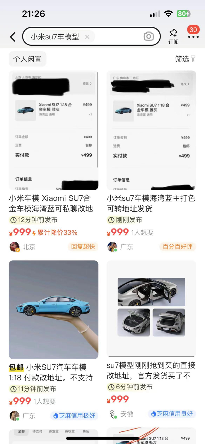 而在二手平台闲鱼上,已经出现大量小米SU7车模型。