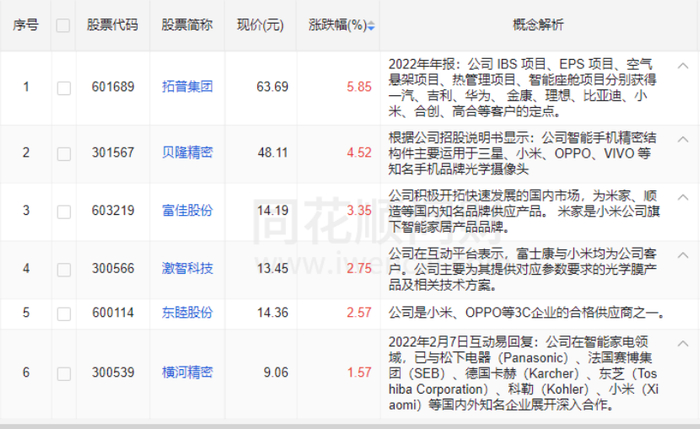 据同花顺问财显示,在121家甬股中,共有6家涉及小米概念——涉及小米智能家居的有富佳股份、横河精密;涉及小米手机业务的有激智科技、贝隆精密、东睦股份。