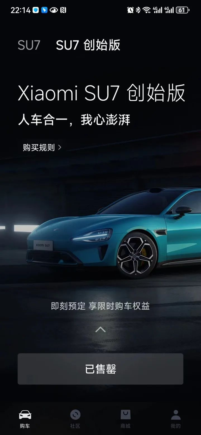 记者查询小米汽车app则显示,创始版车型显示售罄。