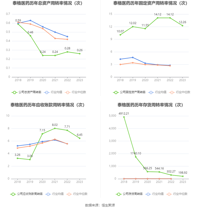 营运能力方面,2023年,公司公司总资产周转率为0.26次,上年同期为0.28次(2022年行业平均值为0.45次,公司位居同行业21/28);固定资产周转率为12.26次,上年同期为14.12次(2022年行业平均值为2.79次,公司位居同行业4/28);公司应收账款周转率、存货周转率分别为6.45次、198.92次。
