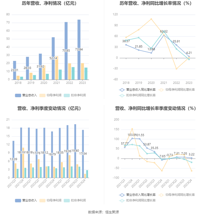 2023年,公司毛利率为38.58%,同比下降1.06个百分点;净利率为29.12%,较上年同期下降2.94个百分点。从单季度指标来看,2023年第四季度公司毛利率为32.82%,同比下降5.28个百分点,环比下降8.35个百分点;净利率为7.04%,较上年同期下降22.70个百分点,较上一季度下降24.91个百分点。