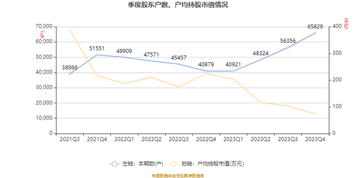 筹码集中度方面,截至2023年末,公司股东总户数为6.58万户,较三季度末增长了9473户,增幅16.81%;户均持股市值由三季度末的103.1万元下降至72.85万元,降幅为29.34%。