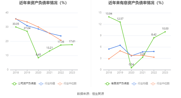 在偿债能力方面,公司2023年年末资产负债率为17.61%,相比上年末上升0.25个百分点;有息资产负债率为10.00%,相比上年末上升1.58个百分点。