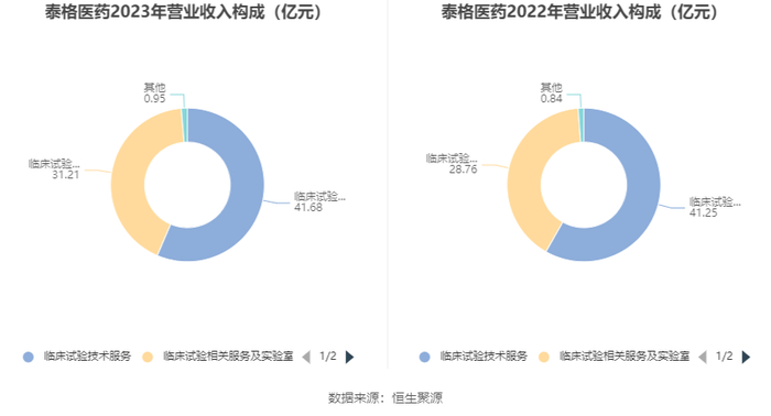 分产品来看,2023年公司主营业务中,临床试验技术服务收入41.68亿元,同比增长1.04%,占营业收入的56.45%;临床试验相关服务及实验室服务收入31.21亿元,同比增长8.51%,占营业收入的42.27%。