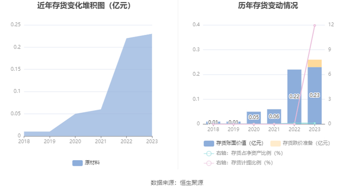 从存货变动来看,截至2023年年末,公司存货账面价值为2339.77万元,占净资产的0.11%。其中,存货跌价准备为317.17万元,计提比例为11.94%。
